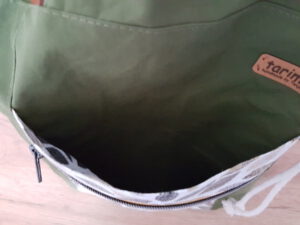 Die Firefly wird oben mit einem Kordelverschluss geschlossen, hat auf der Vorderseite eine kombinierte Reißverschlusstasche mit Steckfach und auf der Rückseite ein tiefes Steckfach.